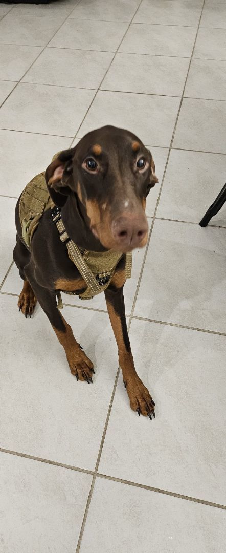 Cocoa, the Doberman Pinscher, is a magnificent canine companion, blending grace, power, and loyalty in one elegant package. With a sleek coat as dark as rich cocoa beans and eyes that gleam with intelligence, Cocoa is a true epitome of the Doberman breed. Standing tall and proud, Cocoa possesses a muscular frame that reflects both strength and agility, making them a remarkable sight to behold.