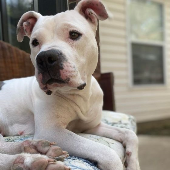 Her foster mom had this to say about her, " We can’t stress enough how sweet Lulu is. She has taught us so much in the 7 months that we have had her. She came into ACS when I saw her beaten up. She was also abused as she flinched and coward down and would run away. When we first got her, she was barrier reactive, and we truly think that it was fear. We didn’t think she would ever be able to co-mingle. She was very sick with an upper respiratory infection that took 5 weeks for her to recover, and we weren’t sure she was going to make it. Training is really helping her, but it will have to be an ongoing effort. She loves it and it has helped us bond. She is loyal, loves people of all ages. She is truly wonderful and whomever gets to give her forever home is blessed"